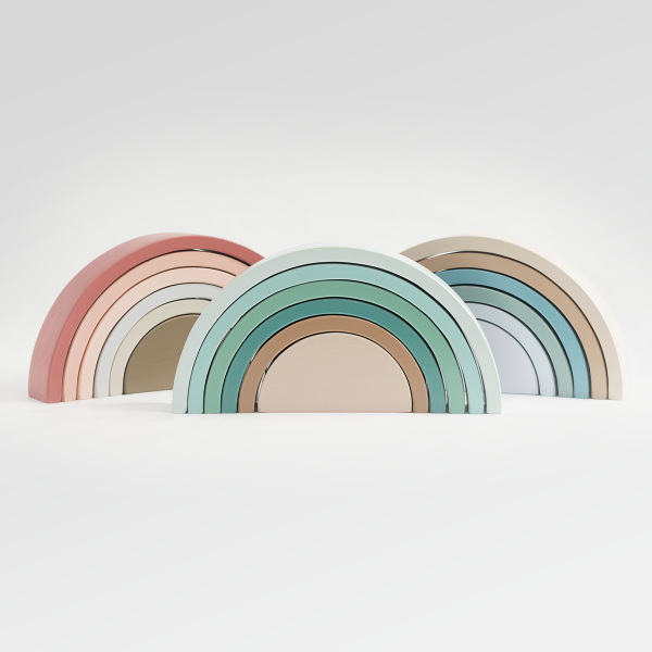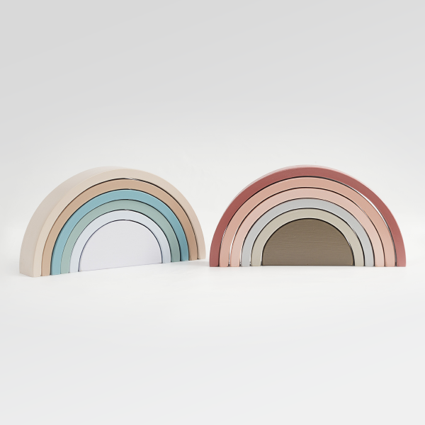 Un arcoíris de 6 arcos en tonos cálidos y envolventes, donde rosados, grises y marrones se combinan evocando la calidez y solidez de la tierra.
