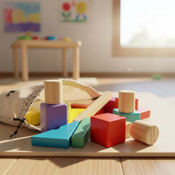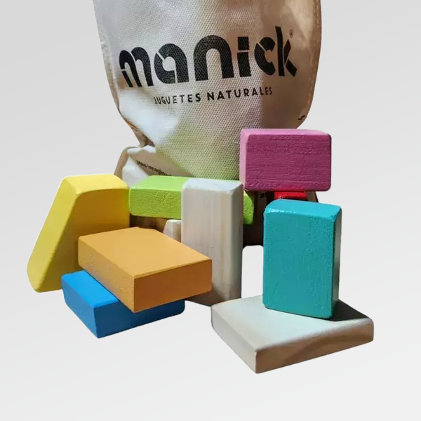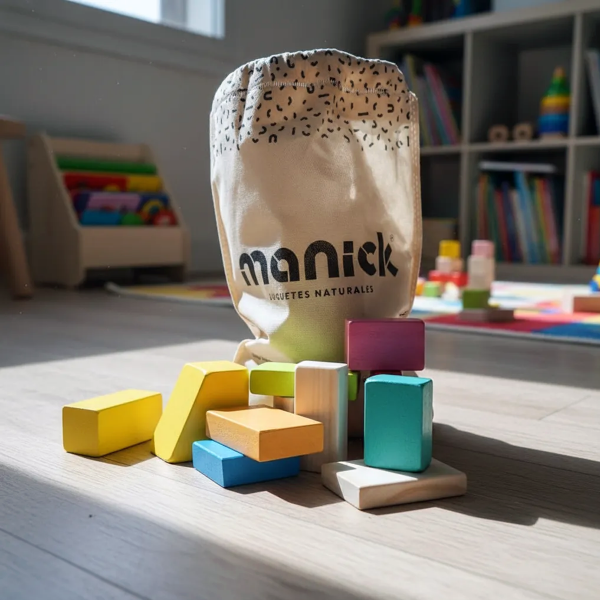 Cada bolsita incluye 20 bloques de madera de formas geométricas variadas, seleccionados al azar, haciendo de cada conjunto una pequeña sorpresa.