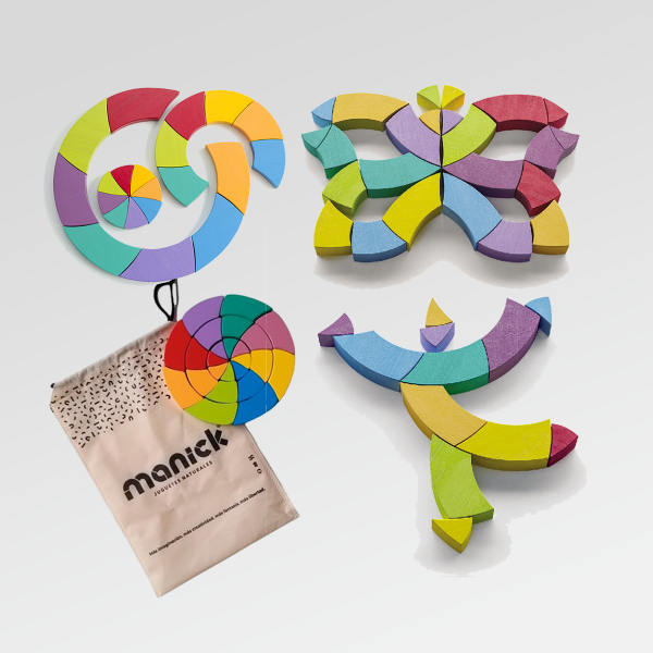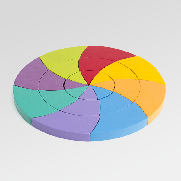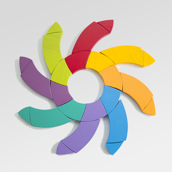 Este Círculo Goethe de madera abre un universo de posibilidades: armar, desarmar, reorganizar y transformar sus piezas para crear formas siempre nuevas. Su disposición circular y dinámica estimula la observación, el pensamiento visual y la experimentación, convirtiéndolo en un material tan lúdico como artístico, ideal para jugar, crear y descubrir sin instrucciones fijas.