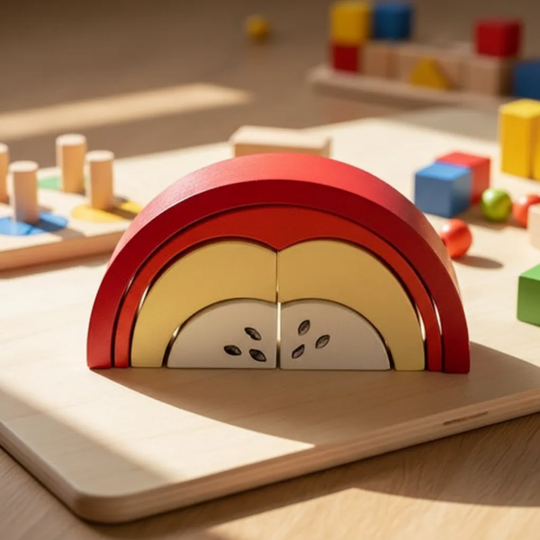 Una fruta de madera luminosa y fresca, formada por piezas que se ensamblan como porciones, ofreciendo una experiencia de construcción clara y accesible.