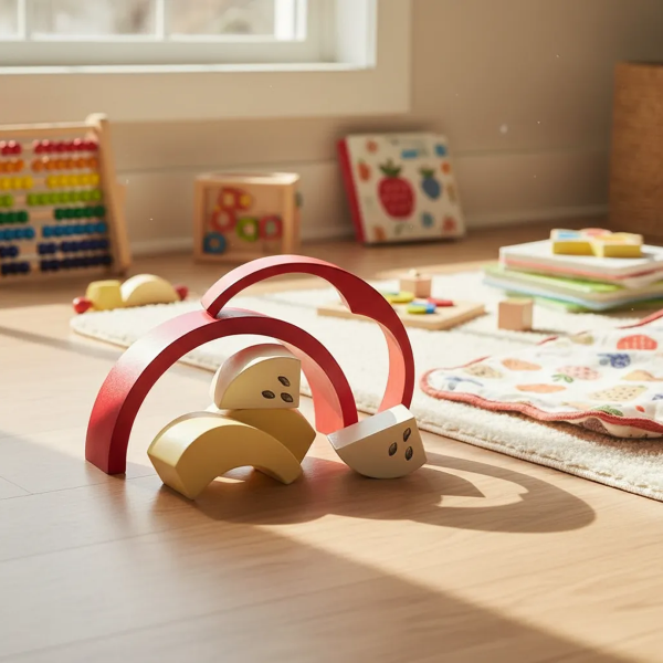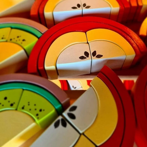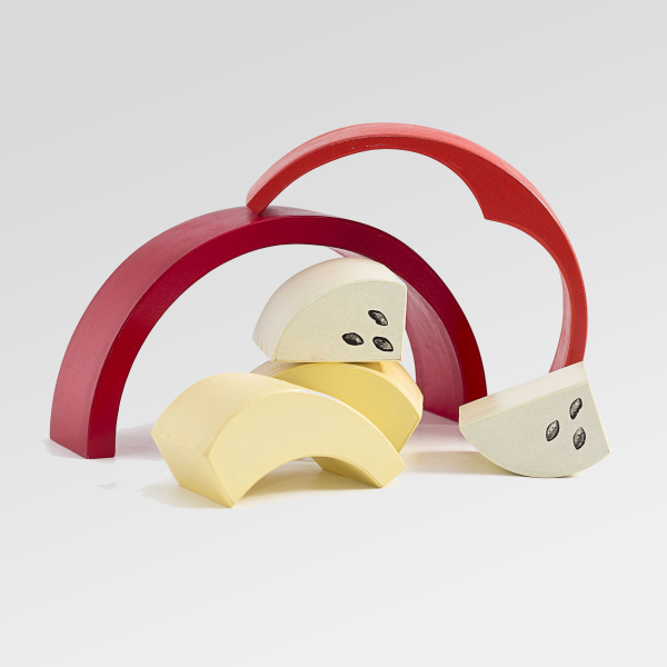 Un conjunto de bloques de madera que representa una manzana de forma original y expresiva, invitando a descubrir cómo distintas piezas se combinan para dar lugar a una figura reconocible.