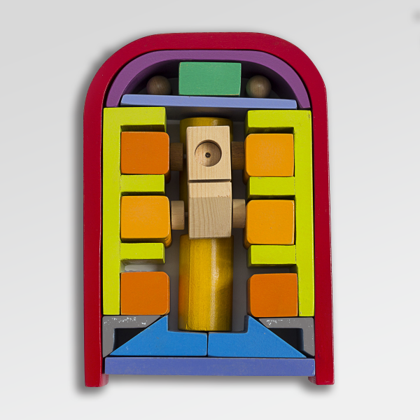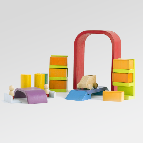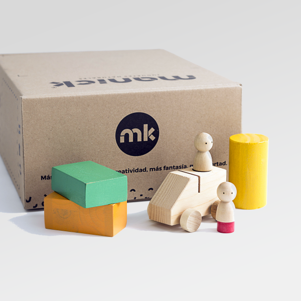 Un conjunto de bloques de madera que invita a recrear escenas de trabajo, movimiento y actividad cotidiana.