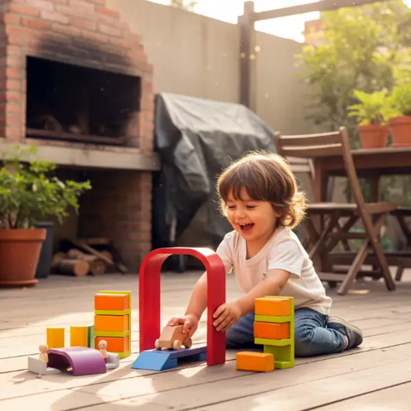 Un juguete que acompaña el juego simbólico, donde las manos construyen mientras la imaginación crea historias de acción, colaboración y descubrimiento.