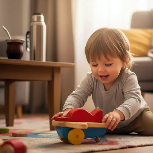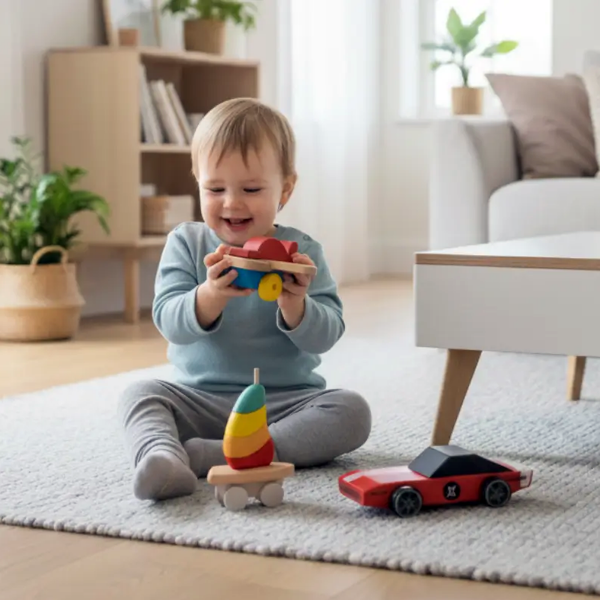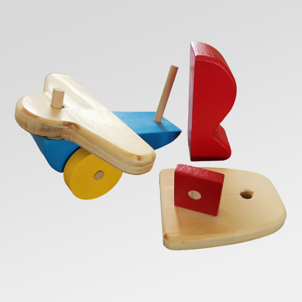 Su diseño desmontable y de ensarte invita a armar y desarmar, mientras las ruedas permiten hacerlo rodar e integrarlo al juego simbólico.