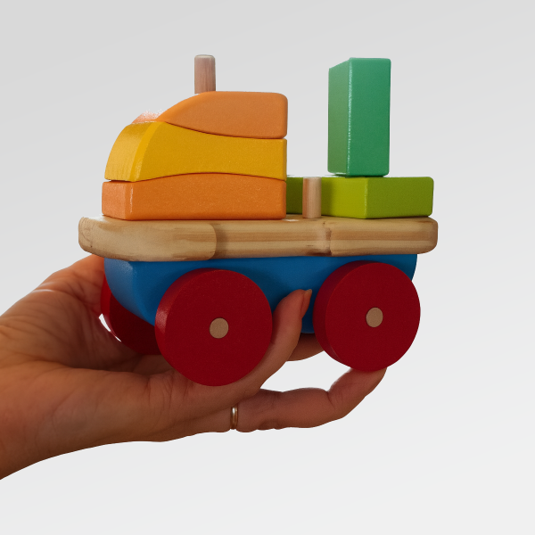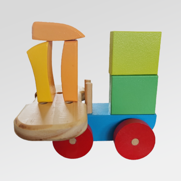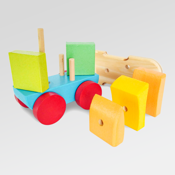 Sus piezas se ensamblan y ensartan con facilidad, permitiendo múltiples formas de armado y fomentando el juego libre. Un vehículo versátil que acompaña la imaginación y se integra naturalmente a otros juegos y construcciones.