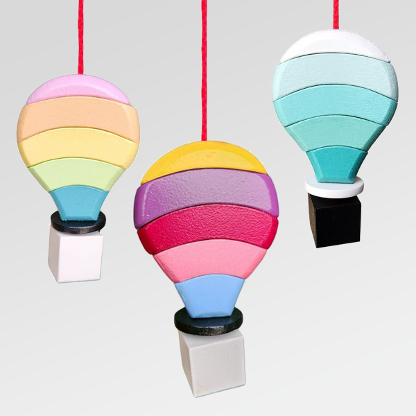 Sus piezas curvas se enhebran progresivamente hasta formar un globo aerostático, convirtiendo el juego en una experiencia visual, táctil y motriz que invita a armar, desarmar y volver a crear.