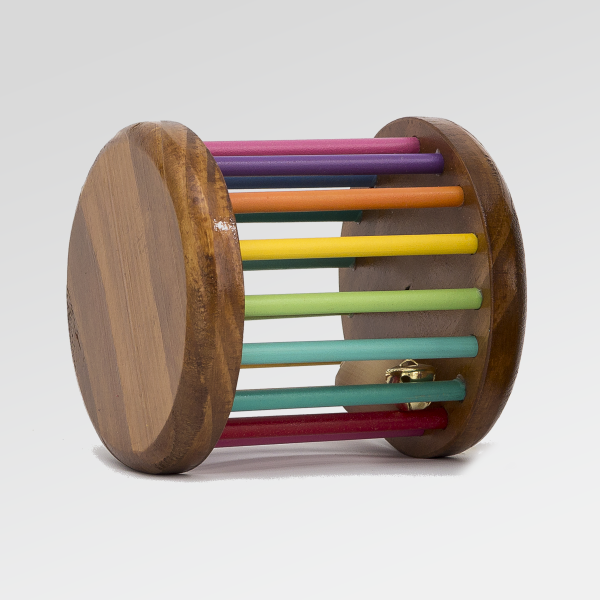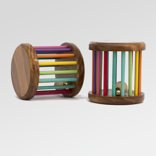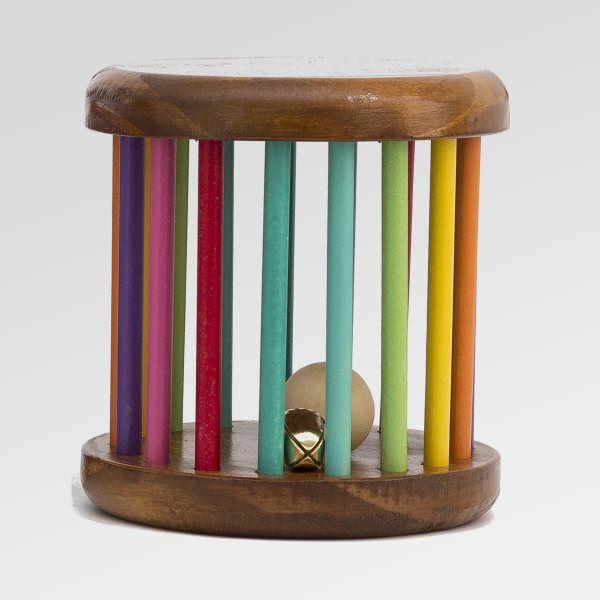 Su formato cilíndrico, y su hermoso diseño colorido, invita al juego activo: al rodar, emite un sonido suave gracias al cascabel interior, estimulando la curiosidad y la atención.