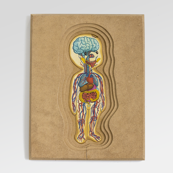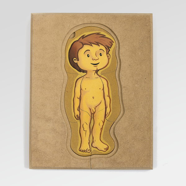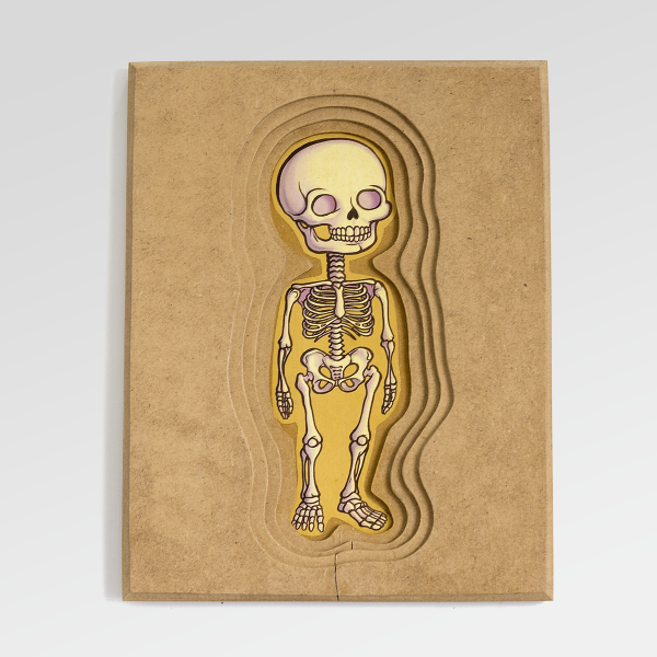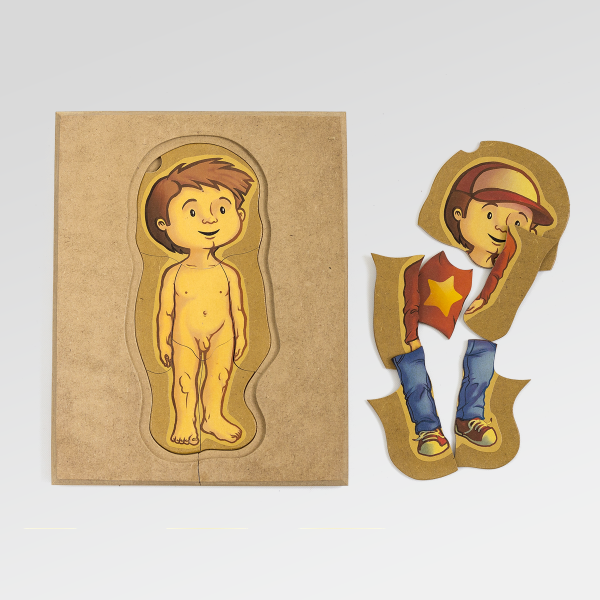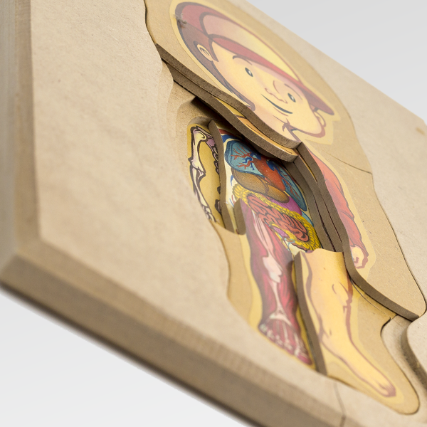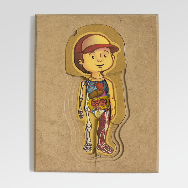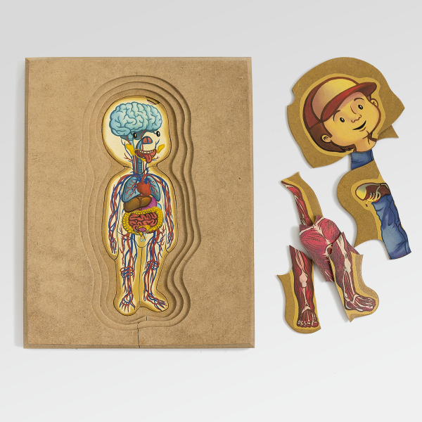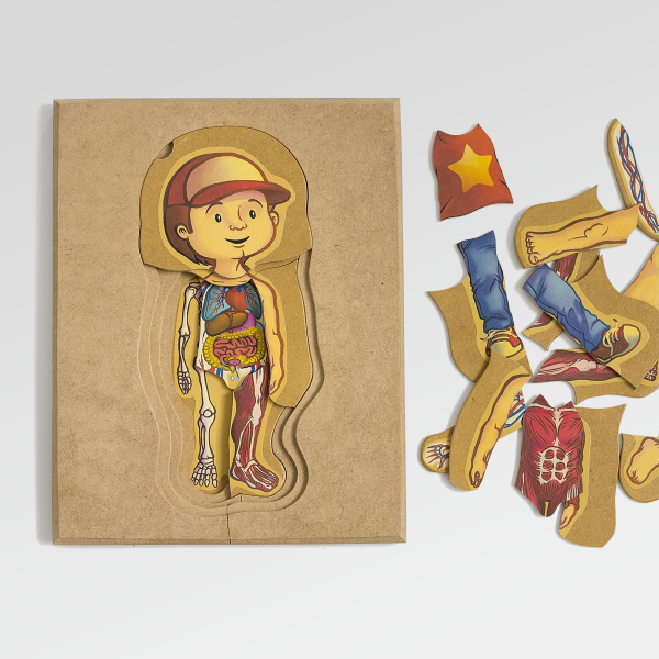 Un rompecabezas de madera en capas que propone un acercamiento progresivo al conocimiento del cuerpo humano.